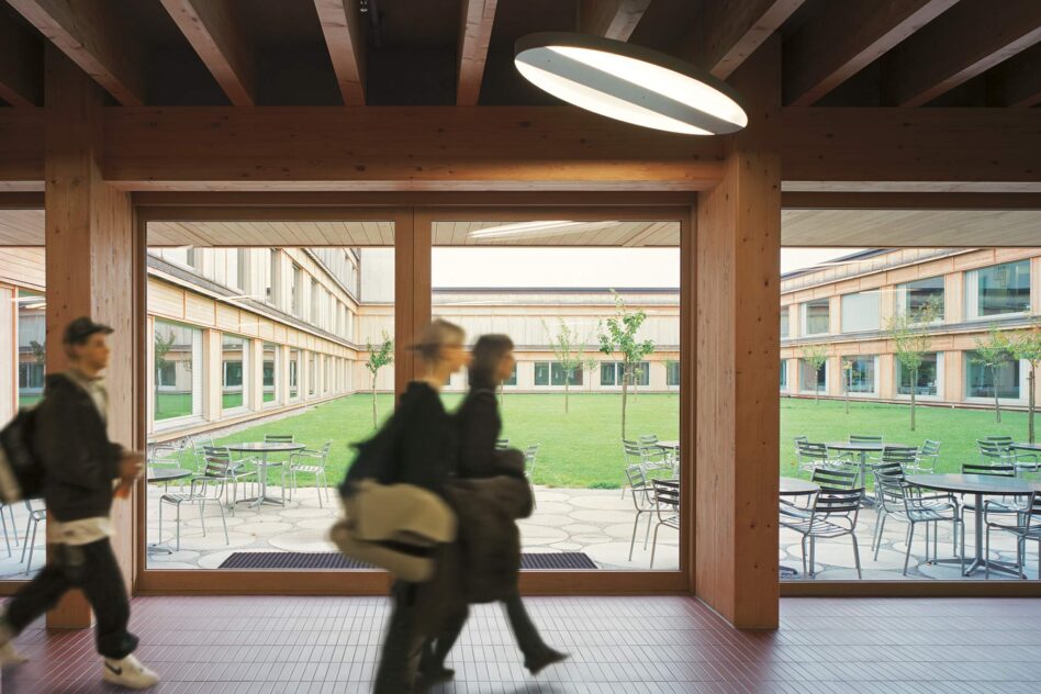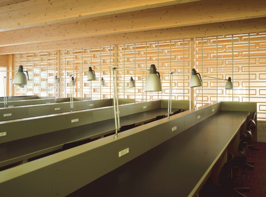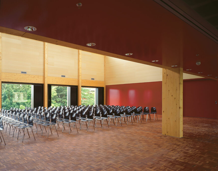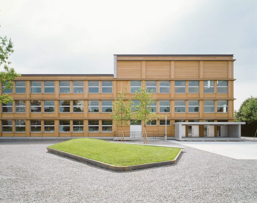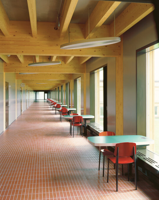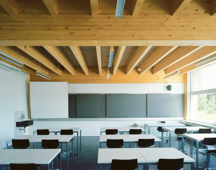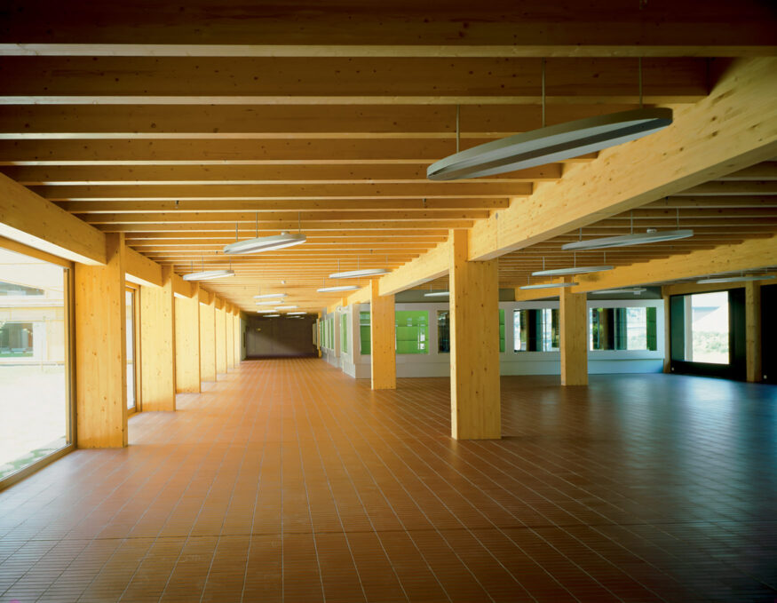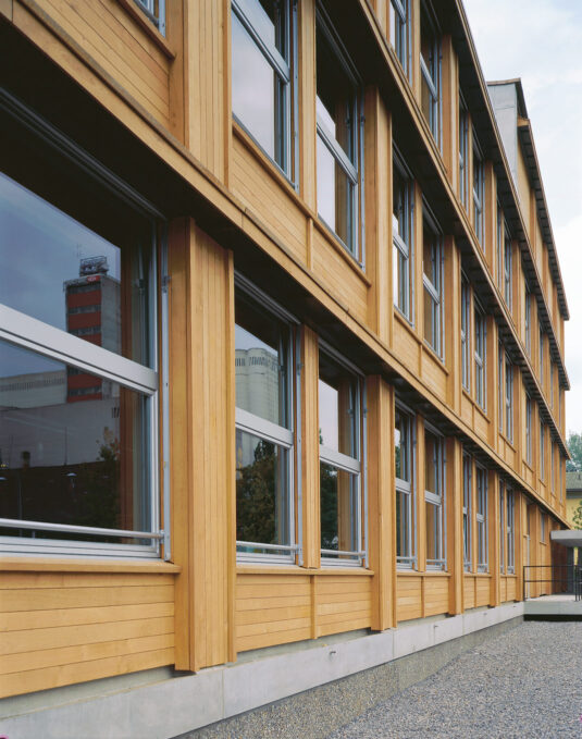 «Der Werkstoff Holz bestimmt die Schule nicht nur konstruktiv, sondern auch atmosphärisch.» Axel Simon, zit. aus: «Holztektonik», in: Bauwelt, Nr. 34, 2004, S. 30