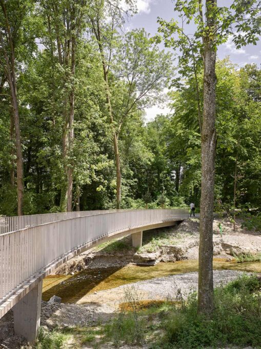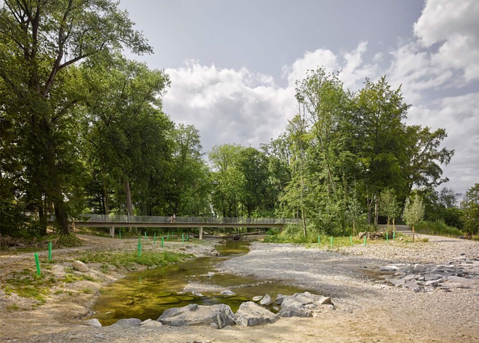 Vielschichtiges Projekt umfasst Disziplinen von Tiefbau, Wasserbau, Landschaftsgestaltung, Brücken- und Hochbau. Murg-Auen-Park, Frauenfeld.