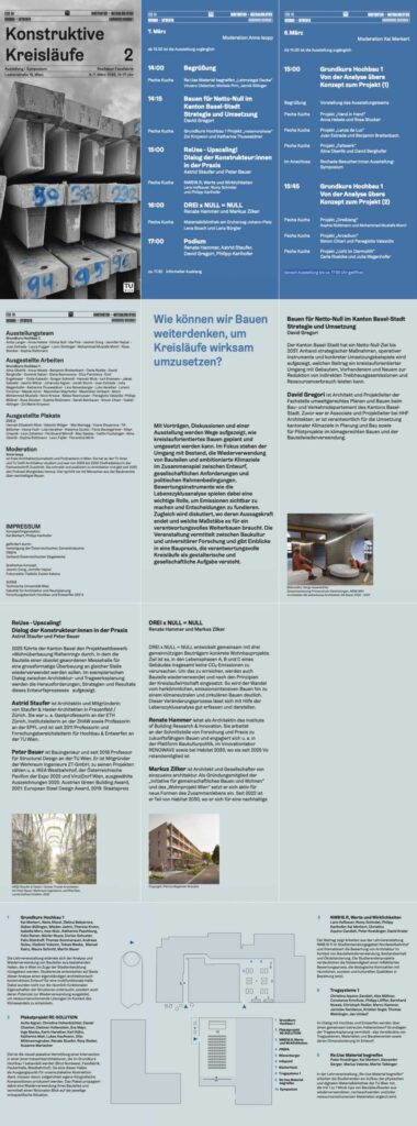 Mit Vorträgen, Diskussionen und einer Ausstellung werden Wege aufgezeigt, wie kreislauforientiertes Bauen geplant und umgesetzt werden kann. Im Fokus stehen der Umgang mit Bestand, die Wiederverwendung von Bauteilen und ambitionierte Klimaziele im Zusammenspiel zwischen Entwurf, gesellschaftlichen Anforderungen und politischen Rahmenbedingungen. Bewertungsinstrumente wie die Lebenszyklusanalyse spielen dabei eine wichtige Rolle, um Emissionen sichtbar zu machen und Entscheidungen zu fundieren. Zugleich wird diskutiert, wo deren Aussagekraft endet und welche Maßstäbe es für ein verantwortungsvolles Weiterbauen braucht. Die Veranstaltung vermittelt zwischen Baukultur und universitärer Forschung und gibt Einblicke in eine Baupraxis, die verantwortungsvolle Kreisläufe als gestalterische und gesellschaftliche Aufgabe versteht.