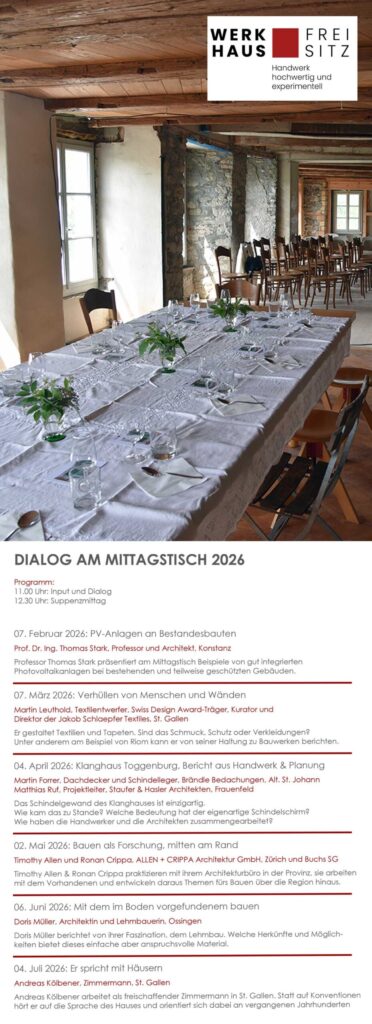 Der Freisitz Tägerschen ist ein Haus zum Arbeiten, Lernen, temporär Wohnen und für Veranstaltungen. Das Werkhaus ist Brennpunkt für hochwertiges und experimentelles Handwerk und Zentrum der Auseinandersetzung mit Baukultur.